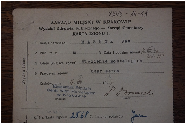 Mimo wieloletnich badań, Eugeniuszowi Misiło brakowało najważniejszego ogniwa – informacji o miejscach pochówku rozstrzelanych. I nie tylko tych straconych w Krakowie, ale również skazanych na śmierć przez sądy wojskowe w Przemyślu, Lublinie, Warszawie czy Olsztynie. Wszyscy ci ludzie zniknęli bez śladu w mroku komunistycznego terroru. Przełom nastąpił niespodziewanie: w aktach jednego ze skazanych Misiło odnalazł dokumenty, które uchyliły rąbka strasznej tajemnicy. Pierwszym z nich było pismo naczelnika więzienia Montelupich, porucznika Bolesława Kubackiego, do Urzędu Stanu Cywilnego w Krakowie. Informował on, że 9 lipca 1947 roku w więzieniu zmarli Ukraińcy: Michał Maczyszyn, Franciszek Zubalski, Włodzimierz Pankiewicz, Mikołaj Serebriany i Michał Stadnicki. Wszyscy byli więźniami Jaworzna.