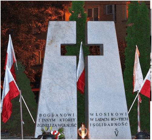 В октябре 1992 года – к десятилетию трагедии – на месте убийства Богдана был установлен памятник работы скульпторши Хелены Лыжвы. Она создала между блоками белого гранита пространство католического креста, а текст под ним объяснял, что этот знак – Богдану Влосику и всем остальным, погибшим в 1980 году за свободу и солидарность польского народа.